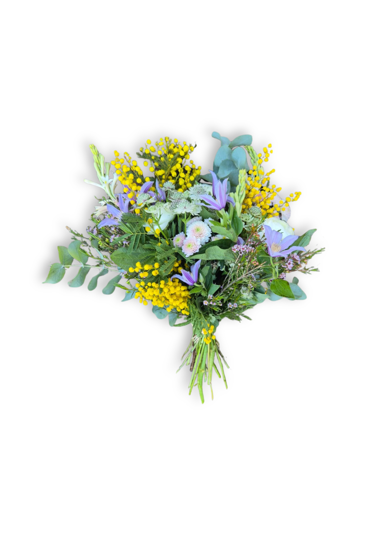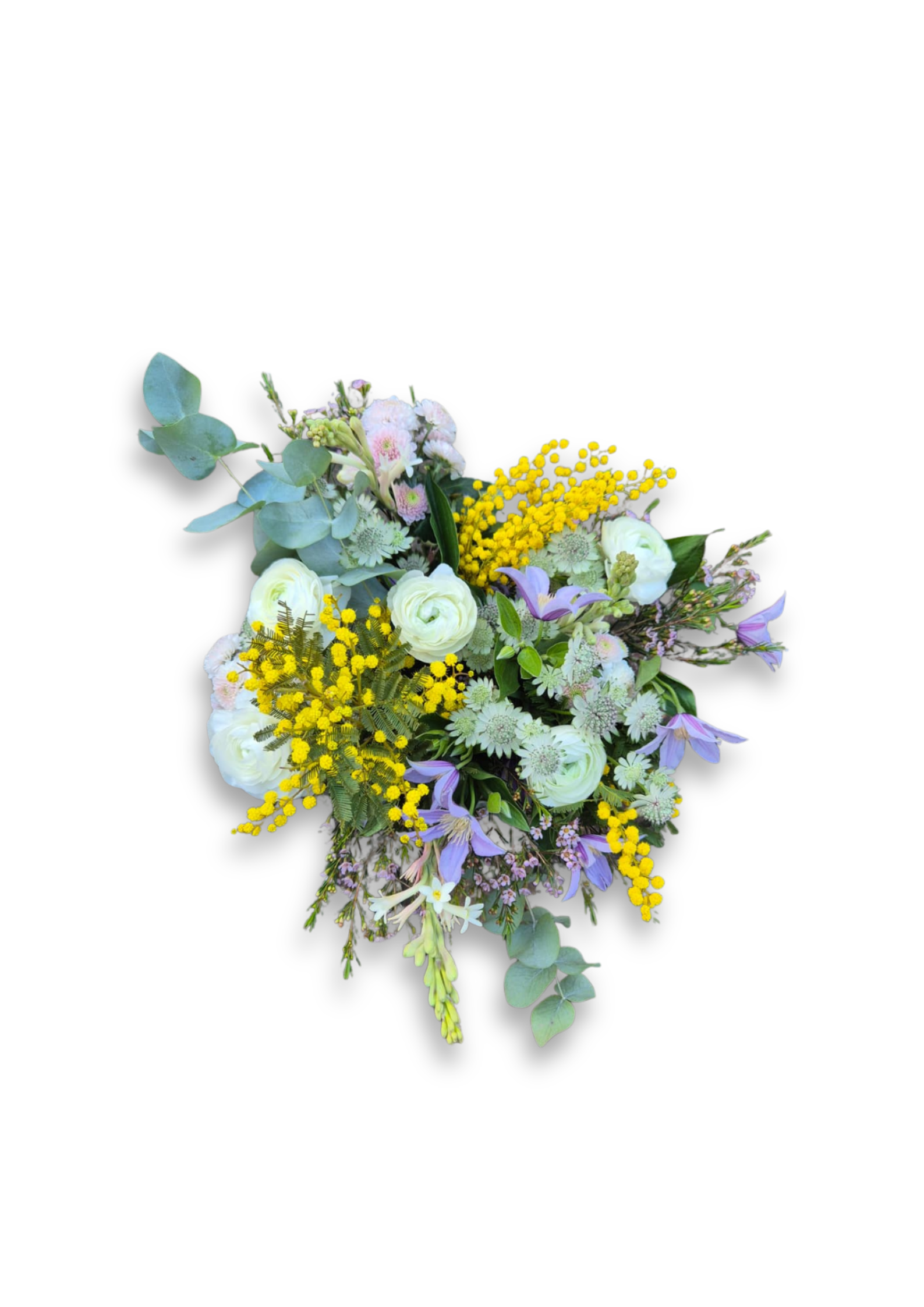 Composition : mimosa, clématites, renoncules, tubéreuses, santinis, astrantias, wax, eucalyptus